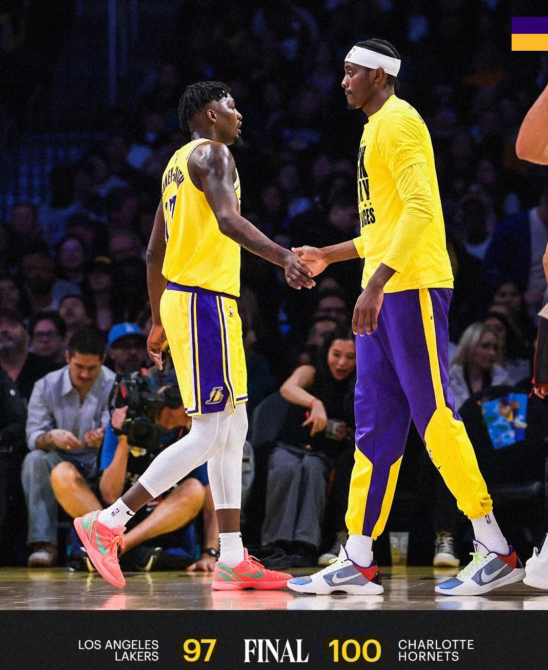 最后三十几秒,黄蜂领先 2 分,他们对八村垒犯规。这时候压力来到了八村垒这边,可惜他两罚不中。鲍尔抓住机会,冲框得手,黄蜂再次领先 4 分。詹姆斯接到球,毫不犹豫,三分出手,球空心入网,比分只差 1 分。黄蜂队发球,鲍尔被犯规,两罚全中。湖人还有最后机会,詹姆斯接球,三分出手,可惜这次没进,紧接着再抢篮板,三分出手,还是没进。最终,湖人以 97 - 100 惜败黄蜂,遭遇两连败。